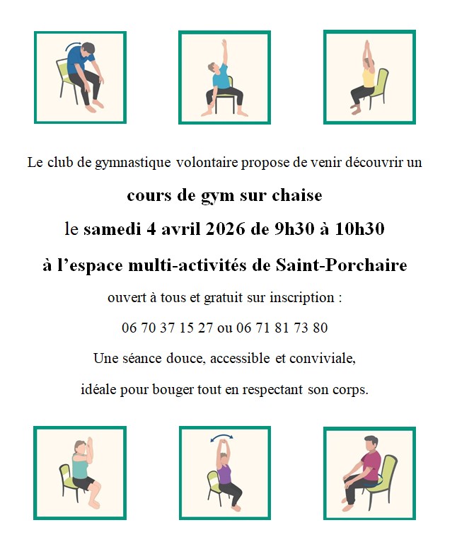 Cours de gym sur chaise + Ajouter à mon Agenda Google + iCal / Outlook export 00 jours 00 heures 00 minutes 00 secondes Date 04 Avr 2026 Heure 09:30 - 10:30 Lieu Espace multi-activités Organisateur Club de Gymnastique Volontaire et de Marche Téléphone 05.46.95.67.26 Partagez cet événement