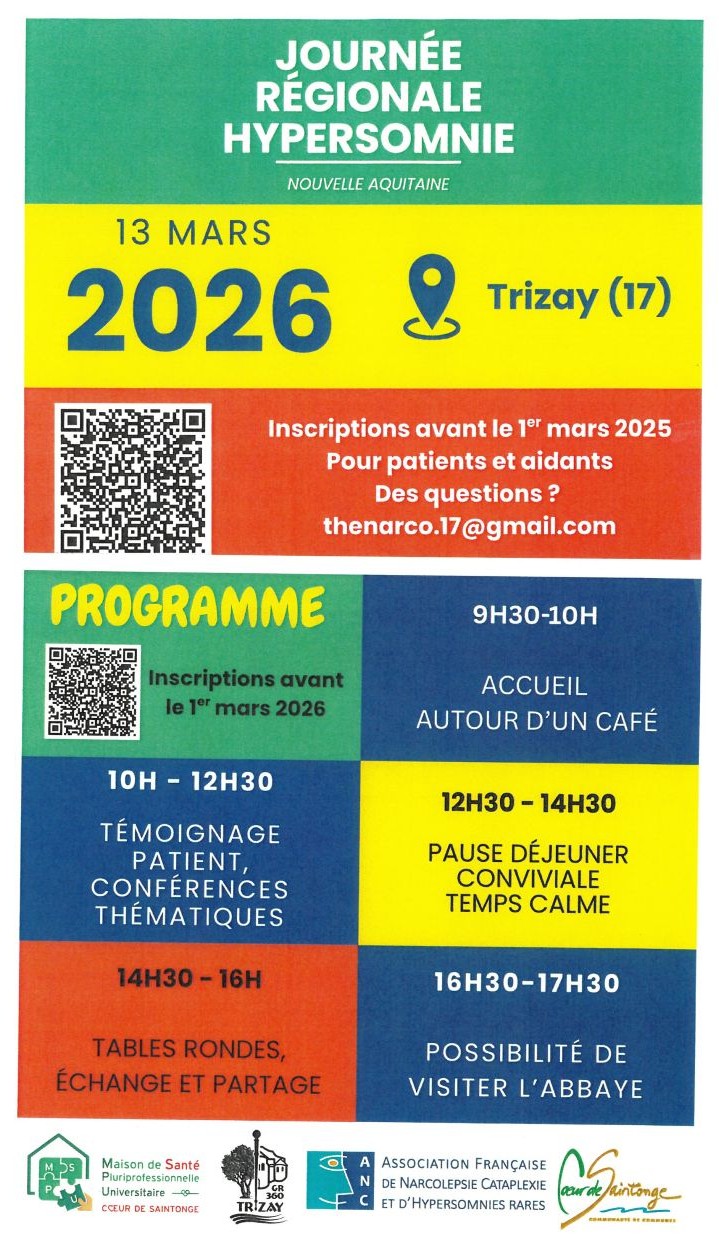 Journée Régionale Hypersomnie + Ajouter à mon Agenda Google + iCal / Outlook export 00 jours 00 heures 00 minutes 00 secondes Date 13 Mar 2026 Heure 09:30 - 17:30 Organisateur Maison de Santé Pluriprofessionnelle Partagez cet événement