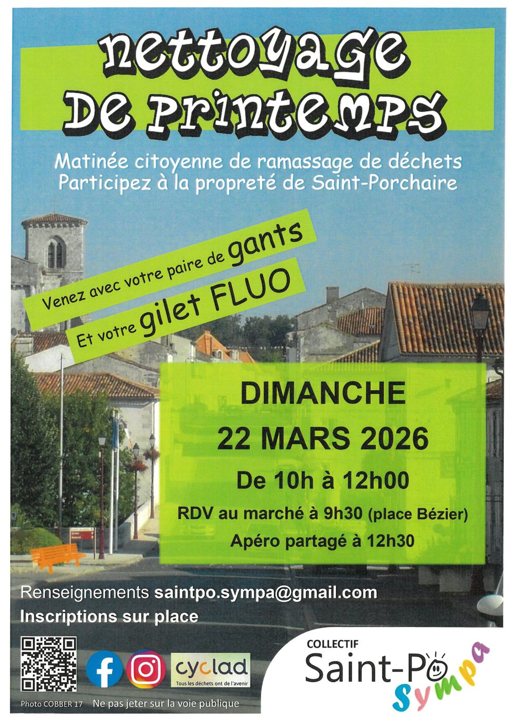Nettoyage de Printemps + Ajouter à mon Agenda Google + iCal / Outlook export 00 jours 00 heures 00 minutes 00 secondes Date 22 Mar 2026 Heure 09:30 - 12:30 Lieu Place Bézier Organisateur Collectif Saint-Po Sympa Partagez cet événement