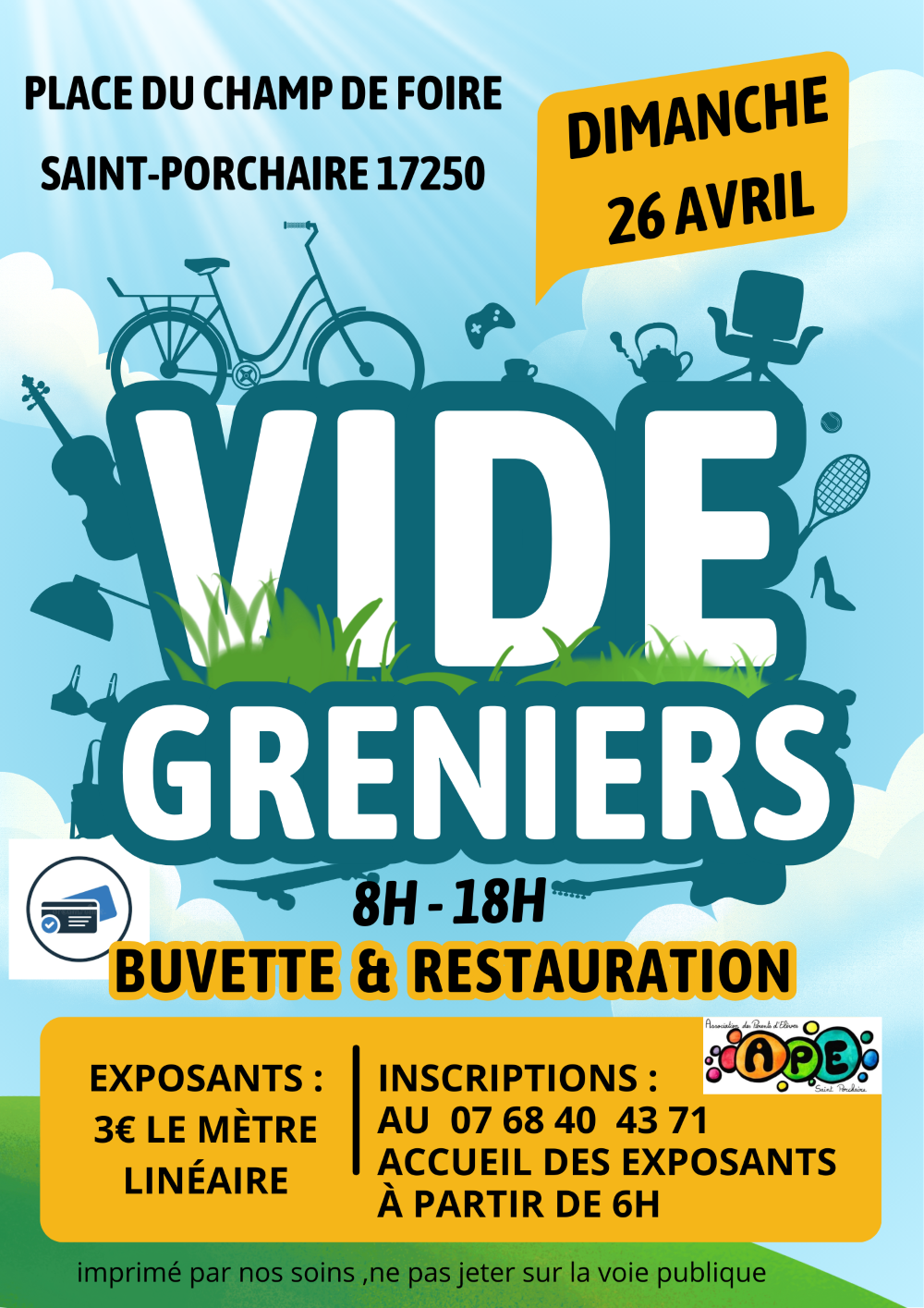Vide grenier de l’APE + Ajouter à mon Agenda Google + iCal / Outlook export 00 jours 00 heures 00 minutes 00 secondes Date 26 Avr 2026 Heure 08:00 - 18:00 Lieu Place du champ de foire Organisateur Association des Parents d'Elèves Partagez cet événement